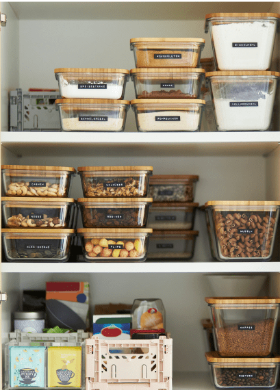 - In a second, put basic food items you use on a regular basis: seasonings, oils, coffee, shelf-stable items like soup or pastas.