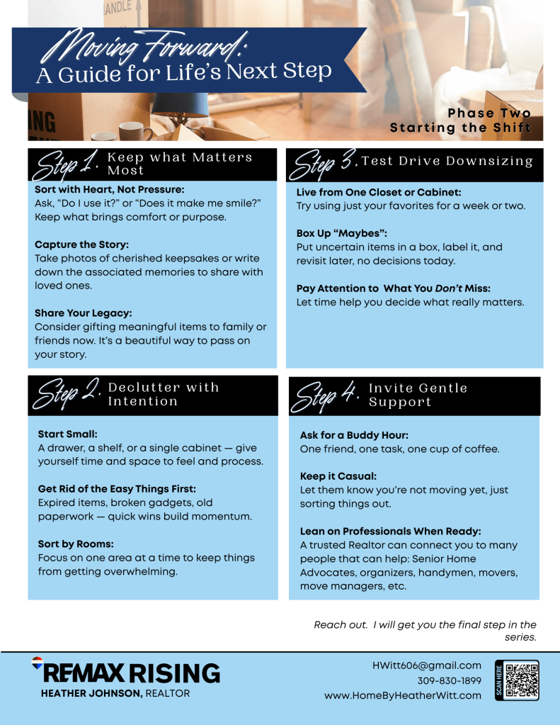 Choosing to downsize, move, or simplify is, without question, not something you need to feel guilty about. It is empowering! Phase two isn’t about selling your home (yet). It’s about getting things in order so that when it is time, you are prepared, confident, and still in control.